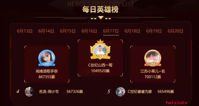 直至今日,我们每日英雄榜的榜单截止目前截图,前三名又发生了小小的变化,虽然不是最终的排名,但也足够可以看到这场PK的火药味和大哥的爆发力。